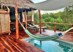 Garden View Treehouse – Een botanische oase vol kleurrijke bloemen en tropische geluiden, voorzien van een ruim bed en een eigen badkamer;