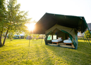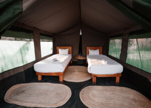 Gasten kunnen kiezen voor een verblijf in ruime safaritenten, elk met een eigen zitgedeelte buiten, perfect om te ontspannen en te luisteren naar de geluiden van de natuur. De tenten zijn van alle gemakken voorzien, zoals warme douches, schone toiletten en alle essentiële voorzieningen voor een comfortabel en verfrissend verblijf in de wildernis.