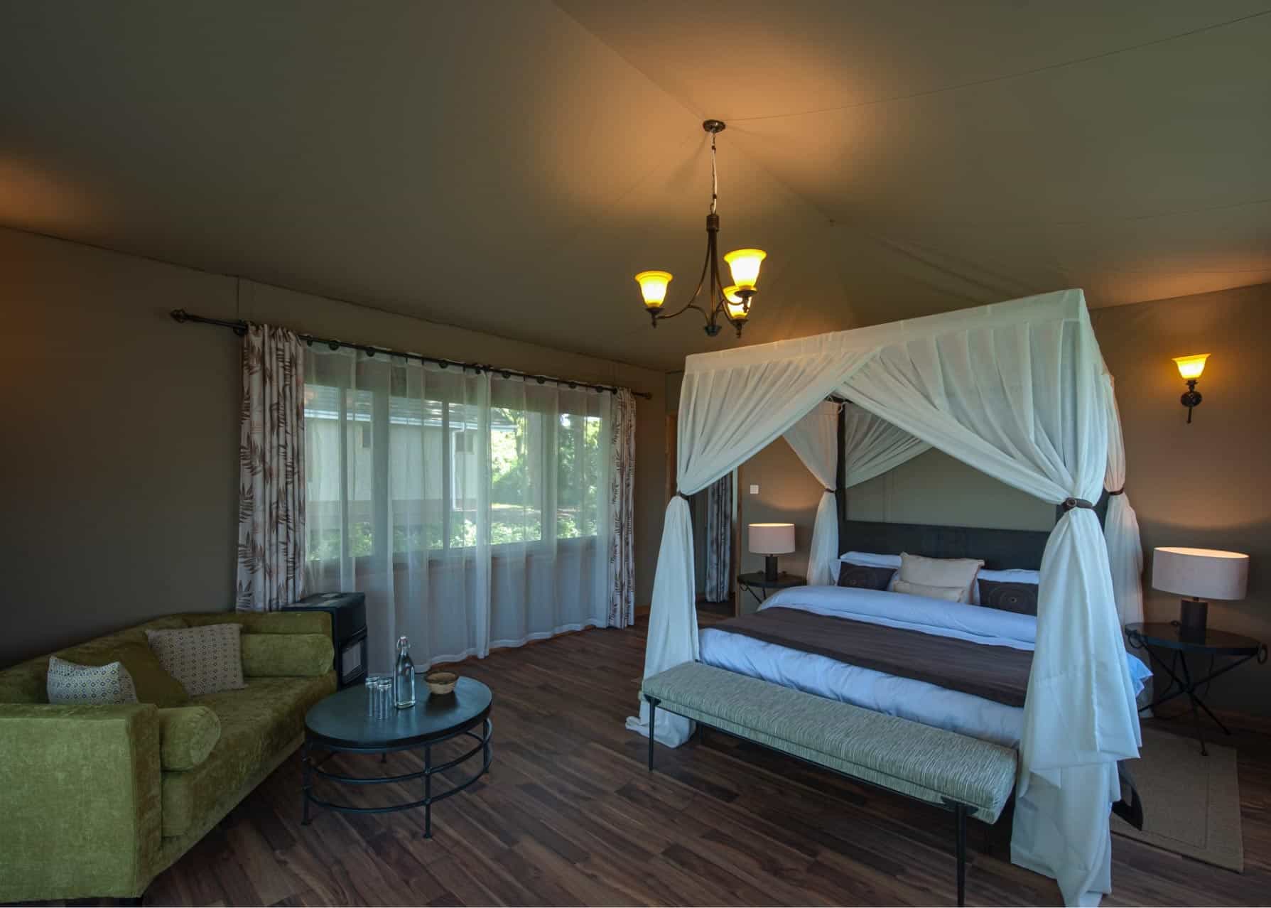 Er zijn verschillende kamertypes beschikbaar, waaronder tweepersoonskamers, familiekamers en een honeymoon suite. Elke kamer is volledig uitgerust met faciliteiten zoals elektriciteit, warme douches, toiletten met spoeling en muskietennetten.