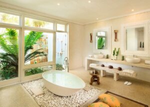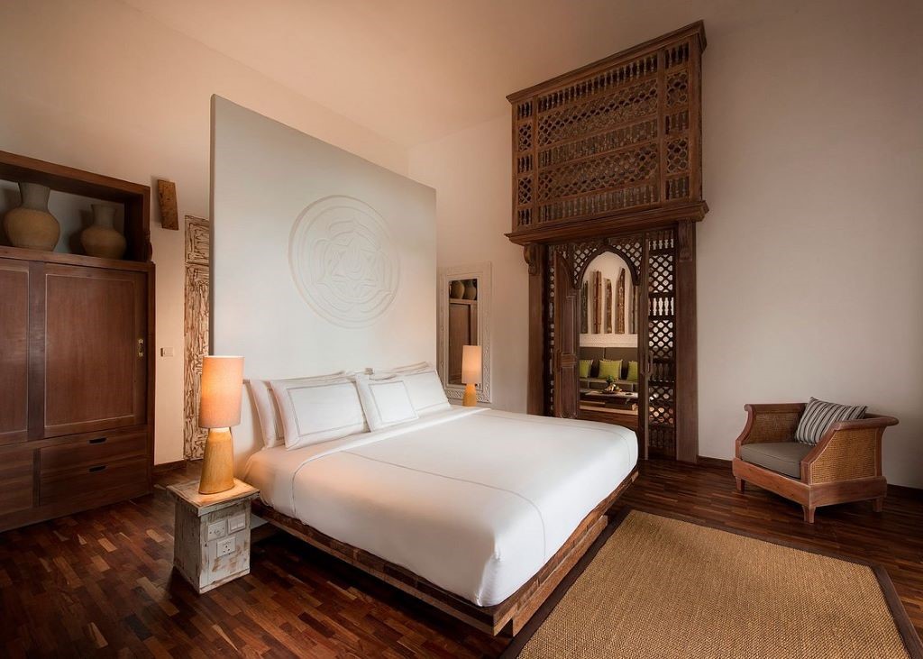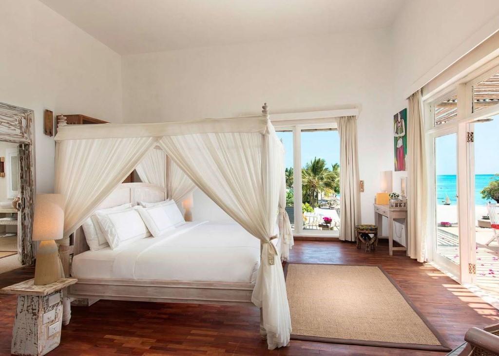 De kamers zijn zorgvuldig ingericht met kunstwerken die passen bij de gemeenschappelijke ruimtes. De extra hoge plafonds van meer dan vijf meter en de grote ramen zorgen ervoor dat je vanuit het bed het strand kunt zien. De badkamers zijn ruim, met zowel binnen- als buitendouches en een stijlvol ligbad, inclusief alle gebruiksgemakken.