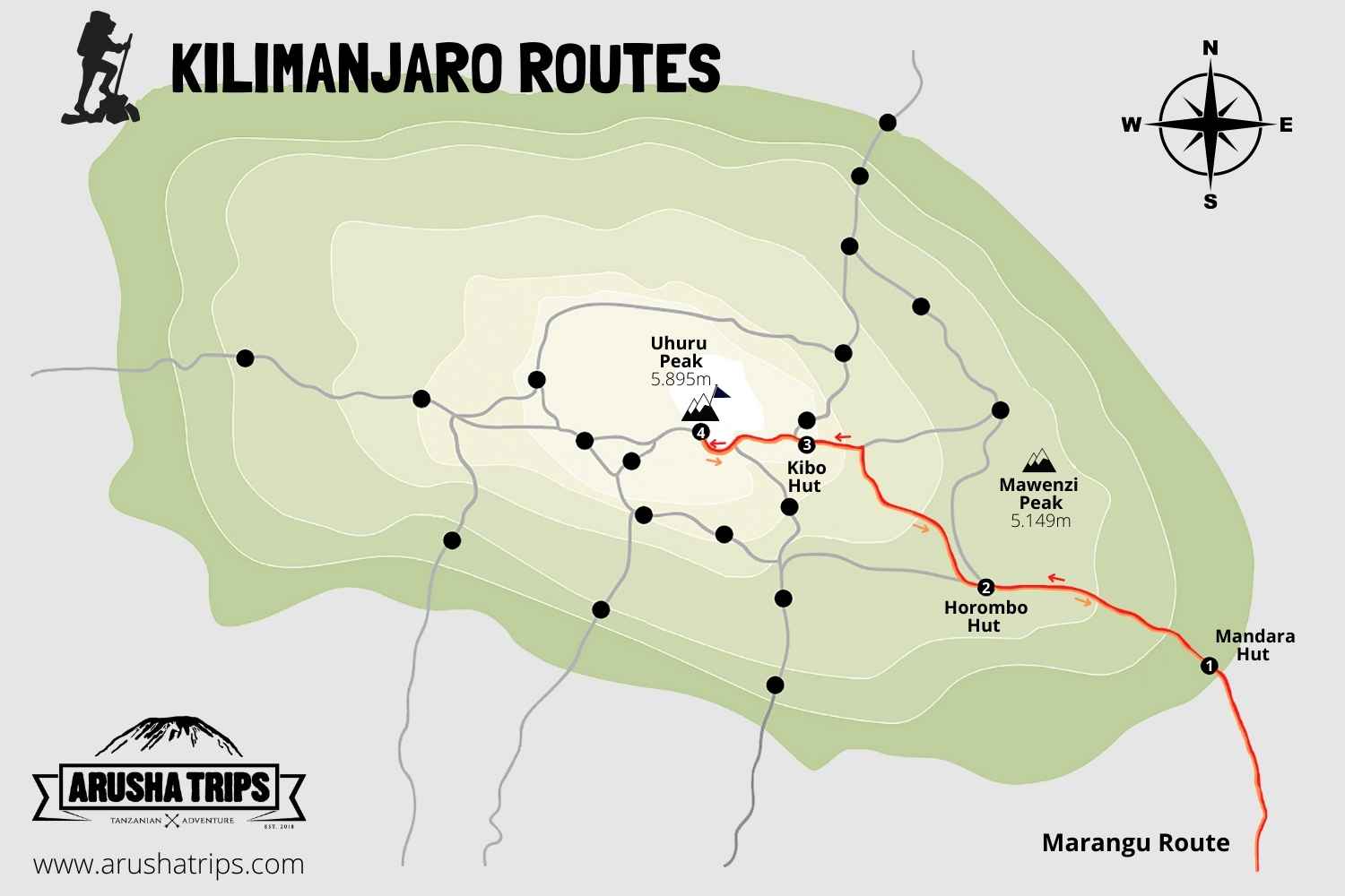 Omdat dit de kortste route naar de top is, is het ook de meest betaalbare. De kortere duur betekent echter dat je minder tijd hebt om onderweg van de prachtige uitzichten te genieten. Als jouw hoofddoel is om de top te bereiken, is deze route ideaal. Wil je meer tijd nemen om te acclimatiseren en de omgeving in je op te nemen, dan is een van de andere routes wellicht een betere keuze.