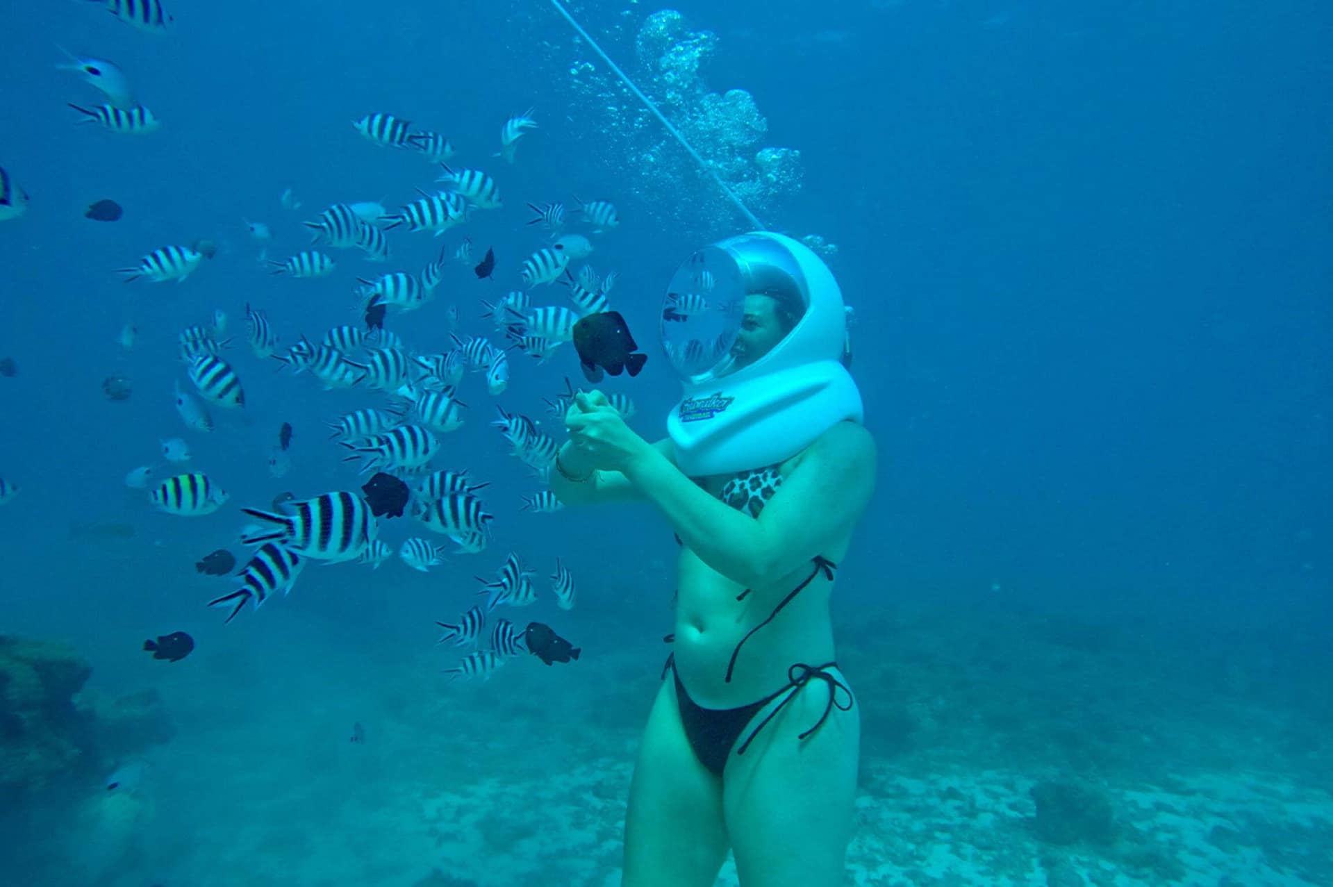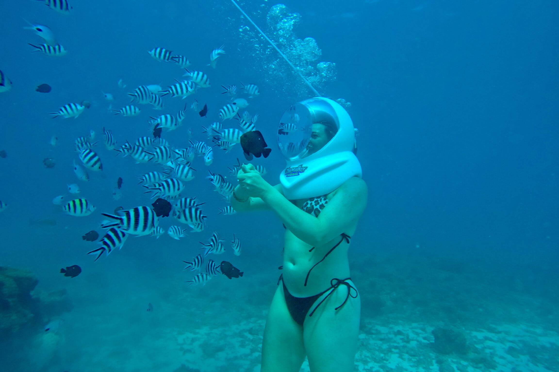 De gids helpt je bij het opzetten van de helm en het langzaam afdalen via de ladder naar de zeebodem. Loop over wit zand terwijl kleurrijke rifvissen om je heen zwemmen, allemaal met kristalhelder zicht. Je kunt koralen, zeeplanten en scholen tropische vissen op ooghoogte zien, wat dit een perfecte ervaring maakt, zelfs voor niet-zwemmers.